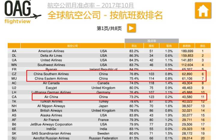另外,OAG flightview報告中還包括“全球航空公司航班數排名”,在該排名前20名有中國南方航空公司和中國國際航空公司3家中國航空公司進入榜單,分列第6、第7和第11位。