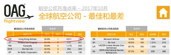 環球網記者發現,在OAG flightview報告中還包括針對“歐洲、中東及非洲航空公司”以及“亞太航空公司”的準點率,在該兩項排名中,德國航空公司Sylt Air、葡萄牙Aero VIP以及菲律賓航空的到達率均為100%,那為何香港航空能以94.8%的準點率奪魁?