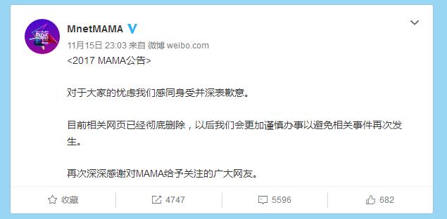 【環球網綜合報道】韓國年度音樂頒獎禮Mnet亞洲音樂大獎(簡稱MAMA)將在12月初於香港舉辦,而在MAMA官網投票頁面(包括中文、韓文、日文、英文頁面),公然把港澳台均作為國家對待,全然不顧“一箇中國”原則 。此事引起中國網民關注,“mama滾出中國”15日登上微博熱門話題。對此,15日23點03分,MAMA在官方微博上發佈道歉公告,內容如下: