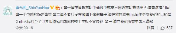 網友@申允熙_ShinYunHee:“第一,請在道歉聲明中通過中韓英三國語言明確指出台灣、香港、澳門同屬一箇中國的既定事實;第二,請不要只發在微博上做做樣子,請在推特、臉書、ins同步更新。我們的目的是讓韓國人民乃至全世界知道我們國家的領土主權不容侵犯;第三,請向我們所有中國人道歉”。
