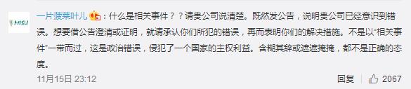 網友“一片菠菜葉兒”稱,“什麼是相關事件??請貴公司説清楚。既然發公告,説明貴公司已經意識到錯誤。想要借公告澄清或證明,就請承認你們所犯的錯誤,再而表明你們的解決措施。不是以相關事件一帶而過,這是政治錯誤,侵犯了一個國家的主權利益。含糊其辭或遮遮掩掩,都不是正確的態度。”