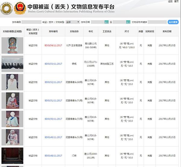 中國被盜(丟失)文物信息發佈平台上線, 已發兩百餘條信息