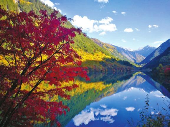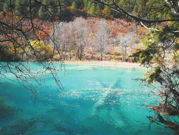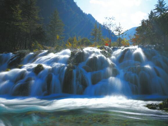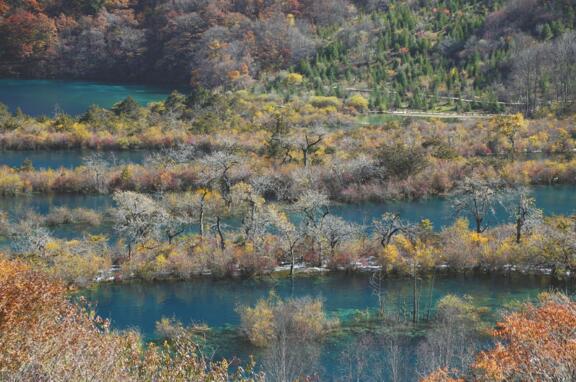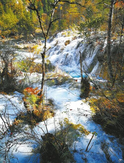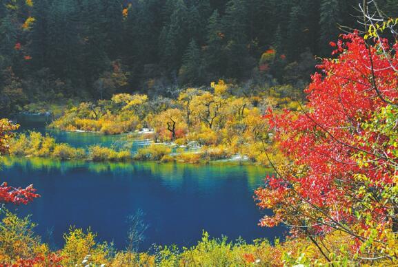 時間如九寨溝的水緩緩流過,正慢慢撫平這裏的傷口。震後的第一個深秋,山林被高原的陽光漸次染紅,依次排開的海子,在大自然的作用下,呈現出寶藍、碧綠、淺藍、透白、鵝黃、深紫的色彩。蘆葦隨風飄搖,海水淌過一株株紅黃相間的青岡樹,然後匯聚到白水河。