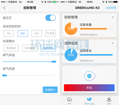 可根據pm2.5顆粒吸附量監測濾網壽命並設有臨界值報警功能;產品可通過藍牙連接到手機,從而進行開關機;連接的APP(GREENLUNG)上可提供詳細的運行狀態和產品信息,包括:電量、濾網壽命、空氣質量預報、呼吸大數據分析、濾網防偽等,用户可將數據分享發社交平台。