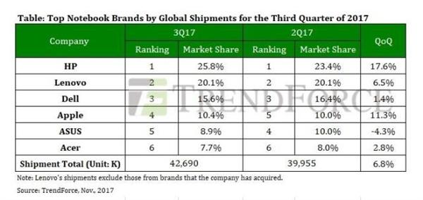 全球筆記本Q3出貨量發佈:第一名地位穩固