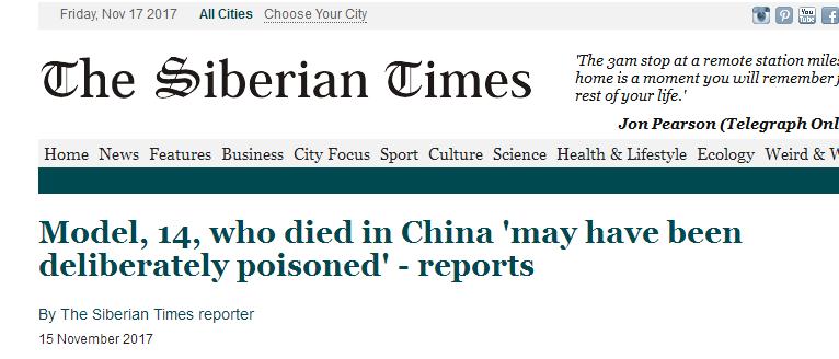 【環球網報道 記者 趙衍龍】“一名年僅14歲的俄羅斯模特在中國突然死亡”的消息近日在俄羅斯媒體、西方媒體上以及在國內引發關注,有報道稱其是“過勞死”,中方公司隨後予以否認。俄羅斯《西伯利亞時報》15日發表一篇題為“死於中國的14歲模特可能被蓄意毒殺”的報道稱,屍檢初步顯示,該模特體內發現了“生物毒藥”的痕跡,其或死於中毒。