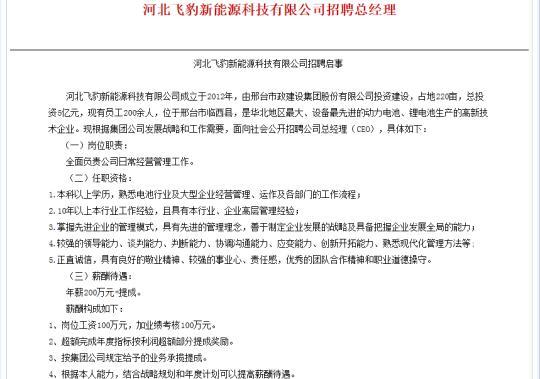記者從邢台市政建設集團官網上看到,2017年11月15日,該公司連發兩條招聘總經理的啓事,分別是河北飛豹新能源科技有限公司和華北中誠科技有限公司。資料顯示,上述兩家公司均是邢台市政建設集團的子公司,招聘總經理崗位的年薪均為“200萬元+提成”。