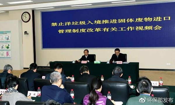 11月16日,環境保護部召開禁止洋垃圾入境推進固體廢物進口管理制度改革工作視頻會議,環境保護部部長李幹傑出席會議並講話。他強調,要牢固樹立和忠實踐行“四個意識”,堅決貫徹習近平總書記重要指示批示精神,堅定不移抓好禁止洋垃圾入境這一生態文明建設的標誌性舉措。
