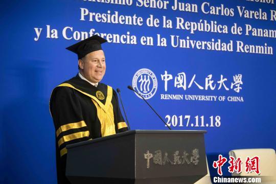 中新網北京11月18日電 (記者 馬海燕)正在中國訪問的巴拿馬總統胡安⋅卡洛斯⋅巴雷拉⋅羅德里格斯18日到訪中國人民大學,獲授該校名譽博士學位,並受聘成為該校拉美研究中心名譽顧問。
