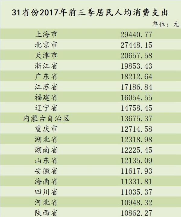 31省份前三季人均消費榜:北京天津上海突破2萬
