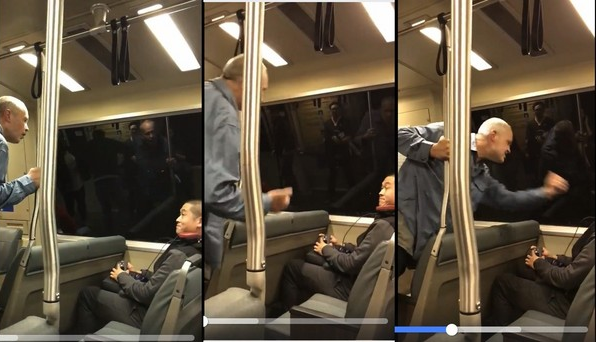 海外網11月18日電 當地時間13日,美國加州舊金山市灣區列車上發生種族歧視事件。一名白人男子在車廂內,以帶有種族歧視的粗俗言詞辱罵一名亞裔男乘客。由視頻圖像可以看出,一名白人男子指着座位上一名看似亞裔的男乘客大叫“我恨你!你們這些‘中國黑鬼’!”