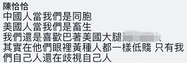 這位網友表示,在美國,到哪都被歧視,小歧視就算了,還總有涉及違法的歧視,但又沒大到讓你花精力去告他,總之,歧視問題最有效的方法就是去找大陸團體。“譬如,你宿舍門牌名字被白人搞小動作丟掉,舍監根本不管,但你找大陸團體,人一多,舍監嚇都嚇死,連忙幫你調監視器,抓人。這已不是個案,幾乎全美國的亞洲人都有遇到過,大多都自己忍氣吞聲,很可憐。”還有網友直呼,“找咱泱泱大國撐腰準沒錯”,“兩岸統一,就沒人敢欺負台灣民眾了”。