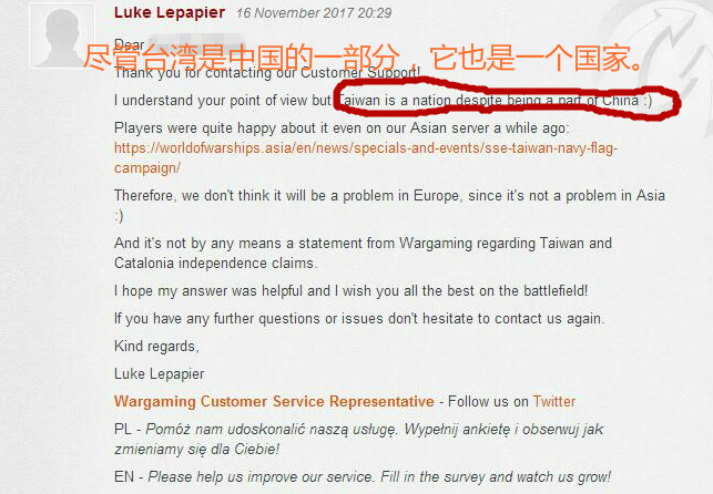 該玩家爆料,自己在遊戲羣裏和小夥伴們提出建議,希望遊戲公司能夠更改不當的稱謂,然而,工作人員的回覆卻明目張膽地聲稱:“儘管台灣是中國的一部分,它也是一個國家。” (“Taiwan is a nation despite being a part of china”)