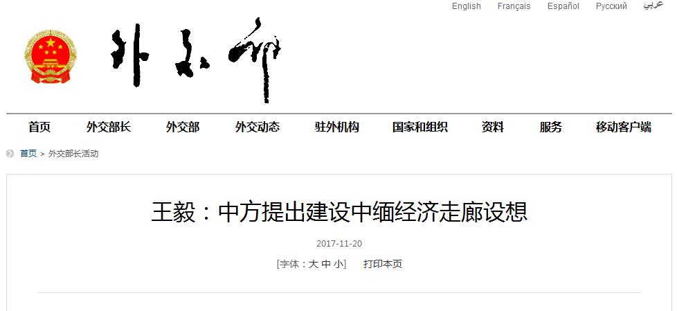 【環球網綜合報道】中國外交部網站11月20日消息,當地時間2017年11月19日,外交部長王毅在內比都與緬甸國務資政兼外交部長昂山素季共同會見記者時表示,中方提議建設“人字型”中緬經濟走廊,打造三端支撐、三足鼎立的大合作格局。