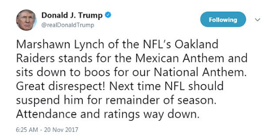 據美國中文網報道,特朗普20日清晨發推説,“馬肖恩⋅林奇,NFL奧克蘭突襲者隊的球員,在奏墨西哥國歌時站着,但在奏我們國歌時卻坐着。這是極大的不尊重!NFL應該給他整季禁賽,(NFL)的入座率和收視率都下降了。”