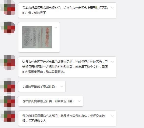 9月11日,亳州市譙城區衞生計生委受理了我的信訪。不過在9月22日簽發的處理意見書中,調查信息全部來自亳州長江醫院提供的材料,沒有徵詢我的説法,和事實並不相符。