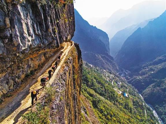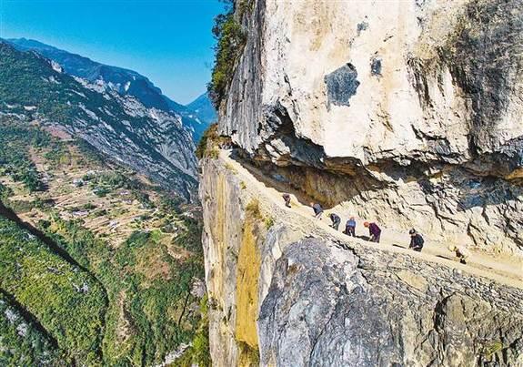 青口嶺崖壁上,寬不過40釐米的羊腸小道,呈“之”字形貼附着。