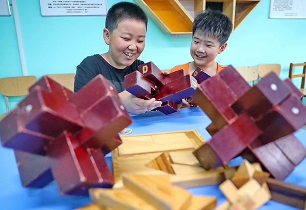 小朋友在體驗益智古典玩具魯班鎖。東方IC 資料圖在《謎之魯班》課堂上,初中生在老師的引導下製作魯班鎖。不少學生是第一次使用中式傳統的鋸、鑿子和銼等工具。“因為平時接觸少,很多孩子一出手就鋸歪了。”一位助教向記者介紹上課情況。