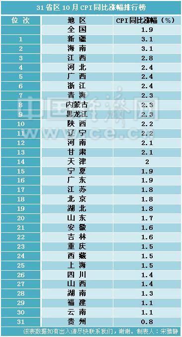 31省區中,CPI漲幅超過全國水平的有14地,全國進入“3時代”增至2省,處於2時代地區有12個,低於2%的有17地,漲幅低於1%僅1地。其中,新疆、海南兩地10月份CPI漲幅並居全國最高,為3.1%,江西和河北次之,兩地分別同比漲幅2.8%和2.4%。10月份貴陽CPI同比漲幅以0.8%的水平繼續墊底,這也是貴州連續三次墊底了。
