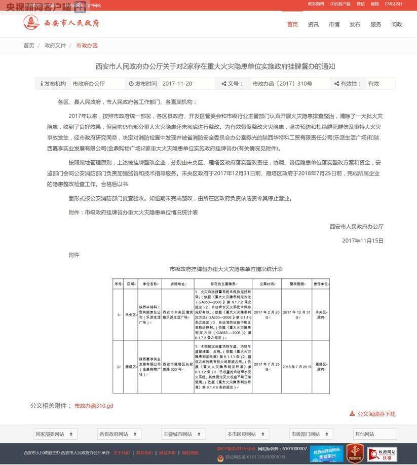 近日,經西安市政府研究同意,決定對消防檢查中發現並被省消防安全委員會辦公室曝光的陝西華特科工貿有限責任公司(樂派生活廣場)和陝西嘉亨實業發展有限公司(金鼎購物廣場)2家重大火災隱患單位實施政府掛牌督辦。