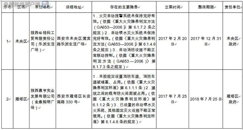 陝西嘉亨實業發展有限公司(金鼎購物廣場)存在的主要隱患是:未按規定設置消防車道、消防車道被堵塞、佔用。2建築之間的既有防火間距被佔用。3已設置的自動噴水滅火系統、其他固定滅火設施不能正常使用。整改期限2018年7月25日。