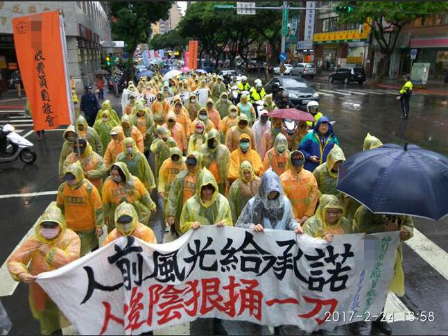 台灣高速公路收費員與桃園空服員工會曾在台當局“勞動部”前舉行“人前風光給承諾 人後陰狠捅一刀”遊行。(圖片來源:台灣“中時電子報”)