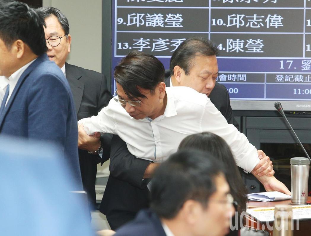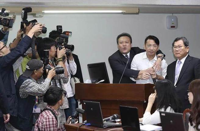 “時代力量立委”徐永明(右二)強佔發言台近11個小時後,在民進黨“立委”強力拉扯出“委員會”後,會議才可開始。(圖片來源:台灣《聯合報》)