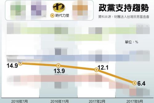 據《聯合報》今年9月份報道,親綠的台灣民意基金會針對政黨進行支持度的調查,“時力”的支持度僅剩6.4%。基金會董事長游盈隆稱,“時力”流失原有支持度的57%,“這對一個新興的小黨可以説是一個非常嚴重的警訊,有邊緣化和泡沫化危機。”