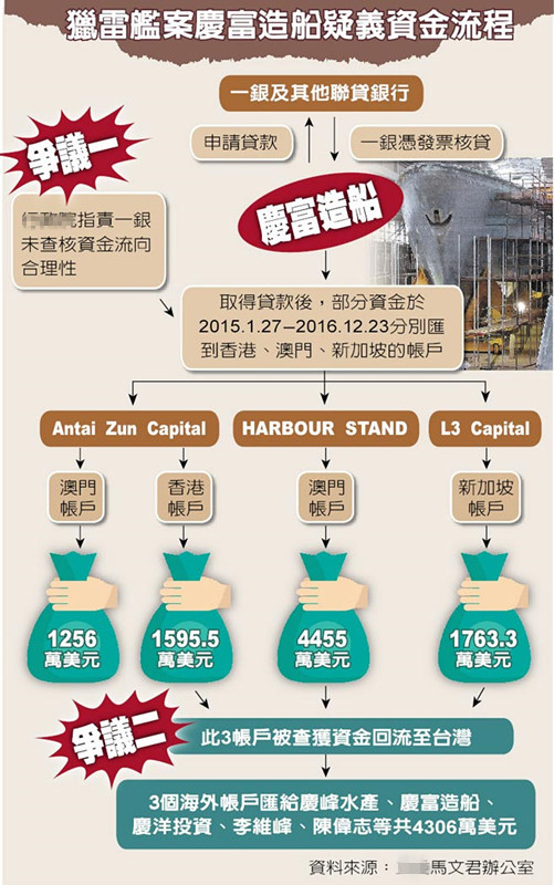 馬文君指出,慶富往Antai Zun Capital香港賬户匯了1595.5萬美元、HARBOUR STAND澳門賬户有4455萬美元、L3 Capital新加坡賬户有1763.3萬美元,這三筆賬户有資金迴流到台灣,匯往慶峯水產、慶富造船、慶洋投資,以及慶富相關人士利瓦伊峯以及陳偉志的户頭,共4306萬美元,約13億新台幣。