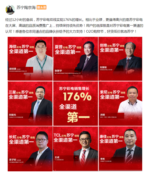 很明顯,蘇寧沒有將眼光侷限於雙十一,而是充分發揮家電第一主場優勢,將觸角延伸至2018年及後續戰略合作。美的與蘇寧簽下3年500億空調合作大單;海爾梁海山與蘇寧張近東定下千億大目標,更直截了當表示蘇寧是海爾最大的渠道;夏普在蘇寧單天狂售近2億驚動總部,郭台銘夜訪張近東送上500億大單……
