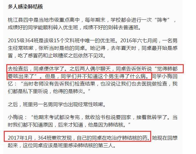 又比如這篇報道還提到,在今年1月,同樣是這個班級的一名學生髮現自己的同桌在吃治療肺結核的藥……可為什麼這個學生沒有將自己看到的情況告訴老師,他當時是否知道肺結核是傳染病,以及這名吃藥的學生自己有沒有告知學校自己得了肺結核,報道並沒有給出説明。