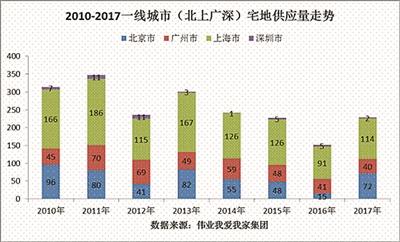 據偉業我愛我家市場研究院數據統計顯示,截至11月17日,北京、上海、廣州、深圳四大一線城市在2017年供應的住宅用地已經達到了228宗,這一數字較2016年全年增長了50%。四大一線城市,尤其是北、上、廣三個城市在2017年的宅地供應力度明顯加大。