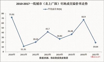 雖然2017年四大一線城市的宅地成交量在增長,但成交的樓面均價、土地均價以及溢價率卻在下滑。截至11月17日,北上廣深的宅地成交樓面均價為16208元/平米,環比2016年下降2.2%;成交土地均價為32642元/平米,環比2016年下降4.8%;平均溢價率則僅有19.04%,較2016年66.9%的高平均溢價率下降了47.86個百分點,近8年來僅高於2011年的平均溢價率。