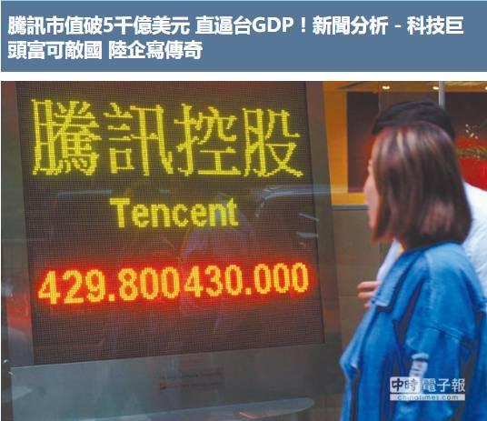 台灣中時電子報22日刊文稱,隨着大陸經濟崛起,大陸各省GDP(生產總值)早已強到“富可敵國”的地步,而騰訊市值20日首次突破5000億美元大關,身價直逼台灣去年GDP總產值5300億美元的水平。