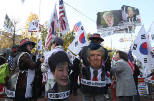 本月初,美國總統特朗普對韓國進行國事訪問。而就在特朗普到達韓國之前,韓國保守團體在首爾市中心舉辦了多場大規模集會。據韓國《中央日報》報道,他們揮舞着太極旗與星條旗,高呼“特朗普要來救朴槿惠了”“無罪釋放朴槿惠”等口號。