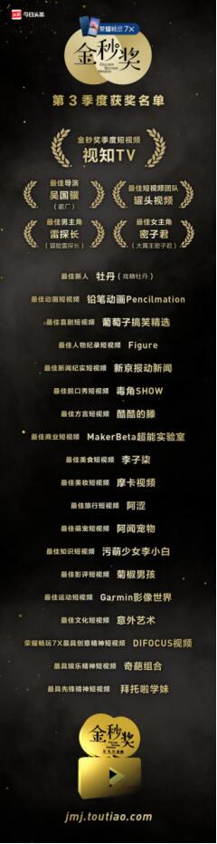 “戲精牡丹”“毒角SHOW”“新京報動新聞”“Figure”等賬號獲得“最佳新人”“最佳脱口秀短視頻”“最佳新聞紀實短視頻”“最佳人物紀錄短視頻”等垂直領域獎項。以下為完整獲獎名單: