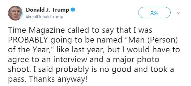 美國當地時間11月24日14時40分許,特朗普發佈推文稱:“《時代週刊》給我打電話説,我‘可能’會被提名今年的‘年度人物’,就跟去年一樣,我需要同意接受採訪,還得拍一張海報大片。我跟他們説,‘可能’這事兒,不太好,算了。但還是謝謝哈!”