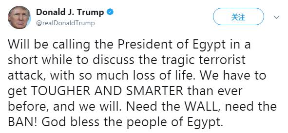 特朗普在推文中還提到,“我們必須比以往更加堅強和精明,我們會做到的。(我們)需要圍牆,需要禁令!願上帝保佑埃及人。”
