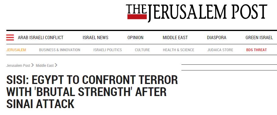 【環球網報道 記者 李德意】埃及北部西奈半島一座清真寺24日發生恐怖襲擊,造成至少235人死亡、125人受傷。此次恐襲事件是埃及現代史上最致命的襲擊之一。埃及總統塞西當晚發表電視講話,誓言“軍隊和警察會於短期內以武力為我們的烈士報仇,及恢復安全穩定”。《耶路撒冷郵報》則以“埃及將採取‘野蠻力量’回應恐襲”為題,表明塞西會對發動大屠殺的武裝分子予以“暴力”回應。