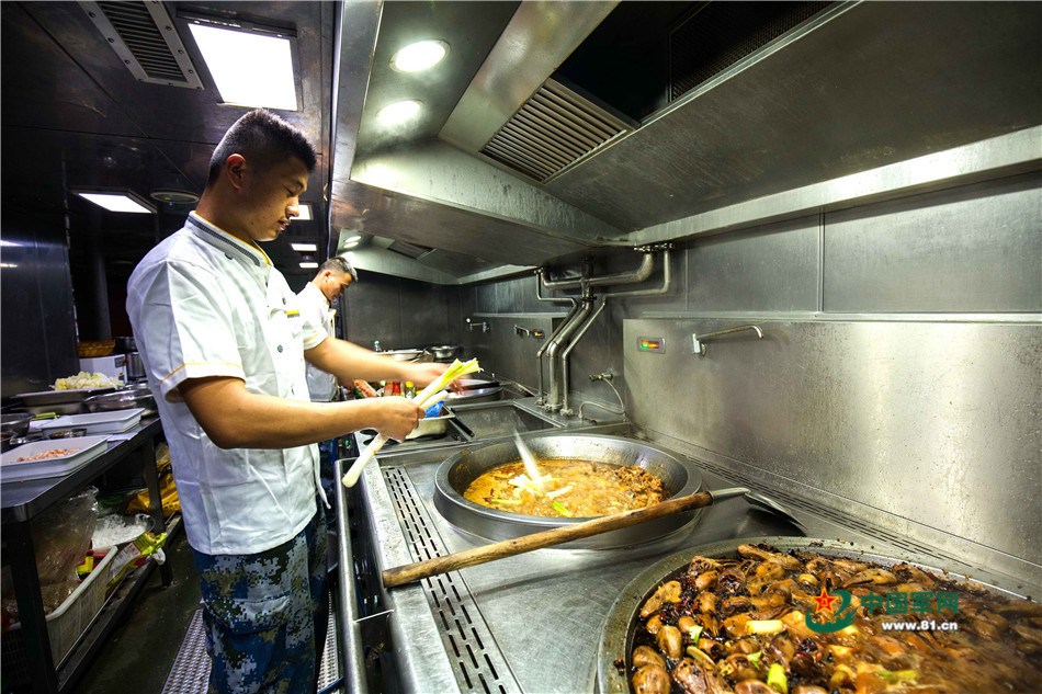 海軍南海艦隊遠航訓練的導彈驅逐艦上的廚房要負責近300人的伙食。在遠海訓練的日子裏,廚師一頓飯就要做五菜一湯。直徑一米的大鍋,鏟勺也各是一米多長,炒一回菜,一次要翻動幾十斤。