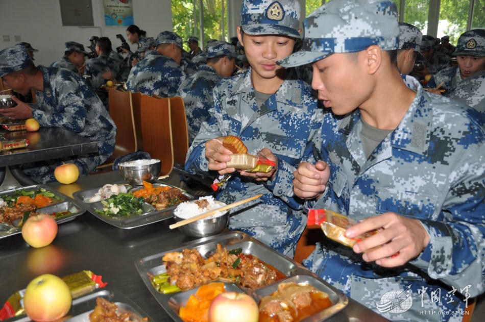 空軍新兵的伙食基本搭配和陸軍相似,節假日會加菜,比如中秋節會給大家配上月餅等節日食物。
