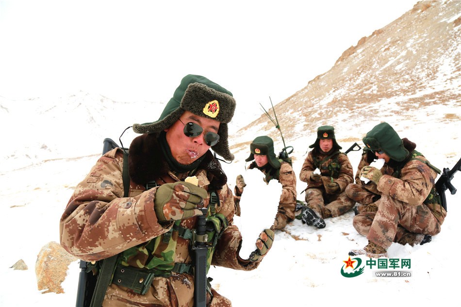 如果外出執行任務,比如出外巡邏,午餐就沒有在連隊裏那麼豐富了,尤其是在海拔幾千米的高原,午餐只能是壓縮乾糧就着雪水。