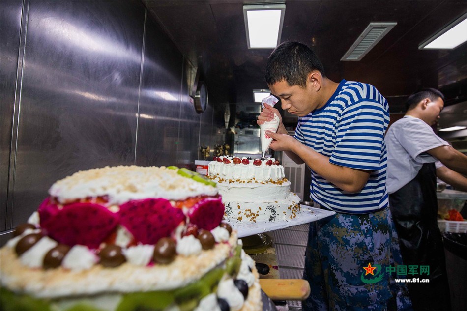 艦艇給水兵過集體生日,廚師親手給大家做蛋糕。
