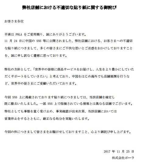 POLA官方網站首頁發佈了這樣一則致歉聲明。
