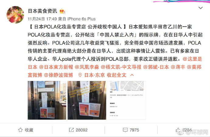 【中國人禁止入內!!!】據日本美食資訊微博,日本愛知県半田市乙川的一家POLA化妝品專營店,公開貼出「中國人禁止入內」的指示牌,此舉在在日華人中引起強烈反響。POLA寶麗是創立於日本靜岡的品牌,在日本被譽為“化妝界四大花旦之一”,昨日就此事做出回應↓↓↓