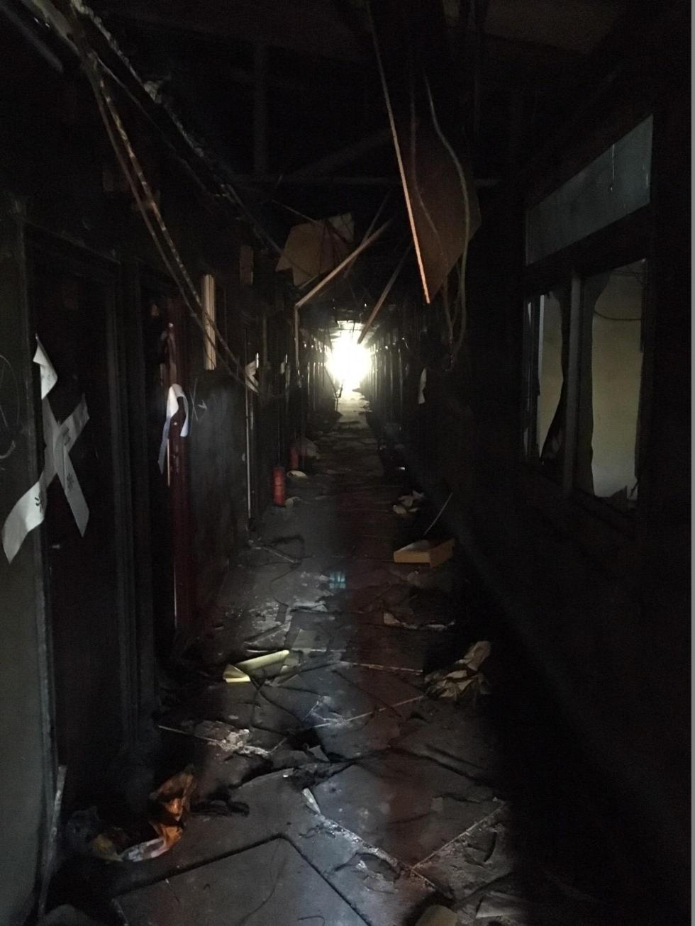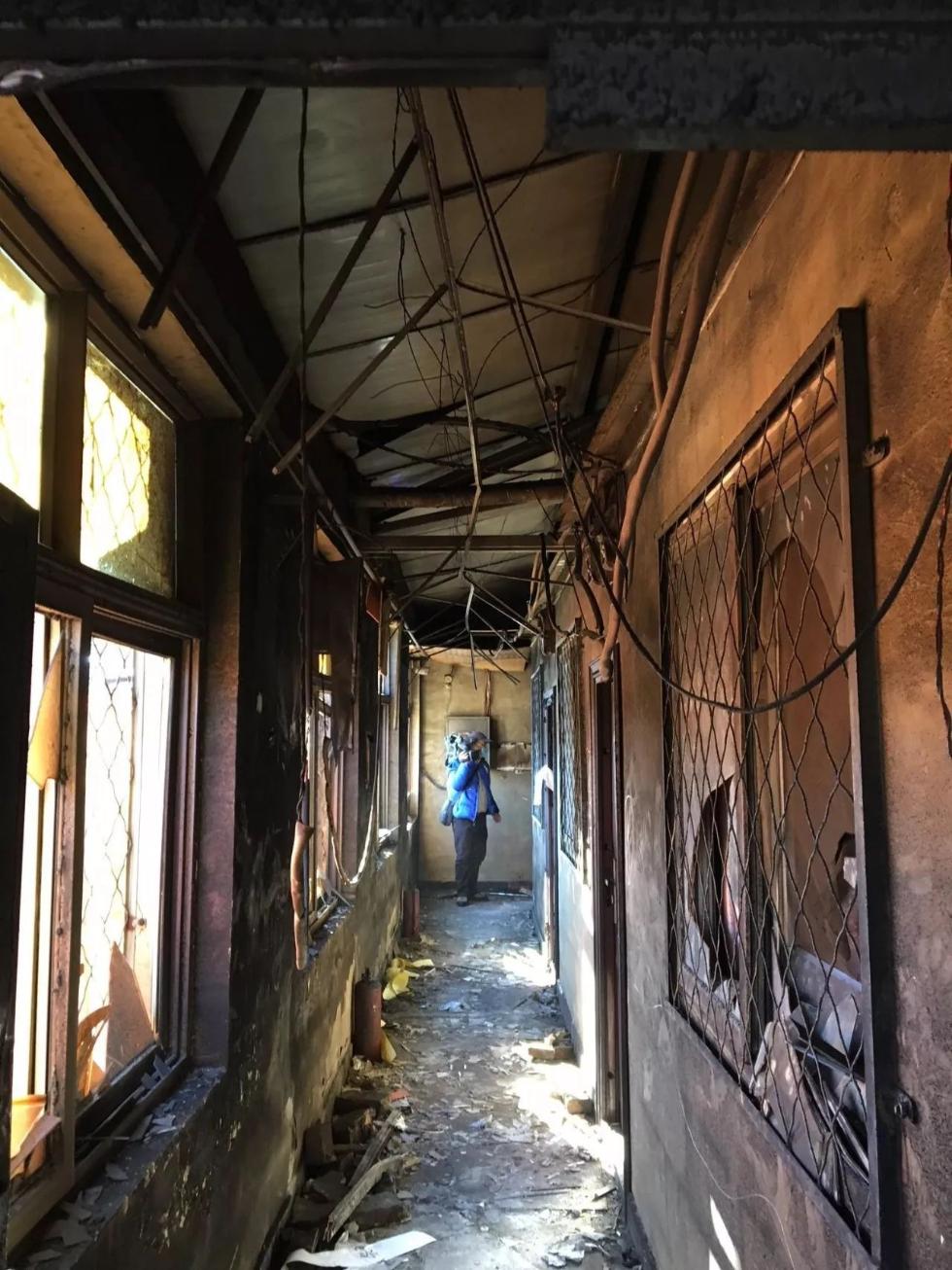 從殘存的樓梯上到二層,記者發現,二層公寓是回字形結構,兩側被分隔成一間間獨立住房。公寓樓道十分狹窄,到處堆放着雜物,走廊內還掛着被燒壞的衣服和小件傢俱。