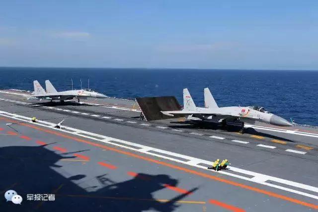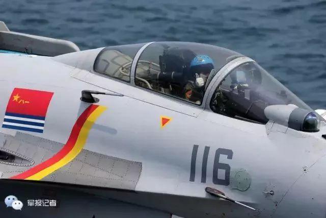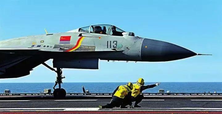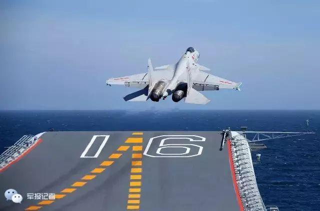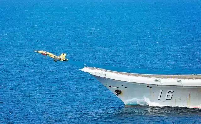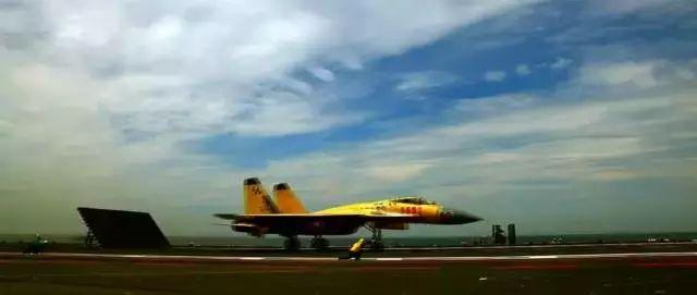 “砰!”止動輪擋迅即放下,飛機如同一匹脱繮的野馬,迅速衝向14度的飛行甲板,在達到甲板頂端的一瞬間,記者看到飛機發動機的火焰由藍向紅,發動機功率在幾秒間達到最大,順利地推動着戰機駛向藍天。