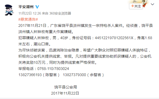 今晚8時許,潮州饒平警方發佈第二則懸賞通告。通告稱,2017年11月21日,廣東省饒平縣汫州鎮發生一宗持槍殺人案件。經偵查,饒平縣汫州鎮人林鐘宏有重大作案嫌疑。犯罪嫌疑人林鐘宏,男,40歲,身份證號碼:44512219781202561X,身高1.68米左右,潮汕口音。