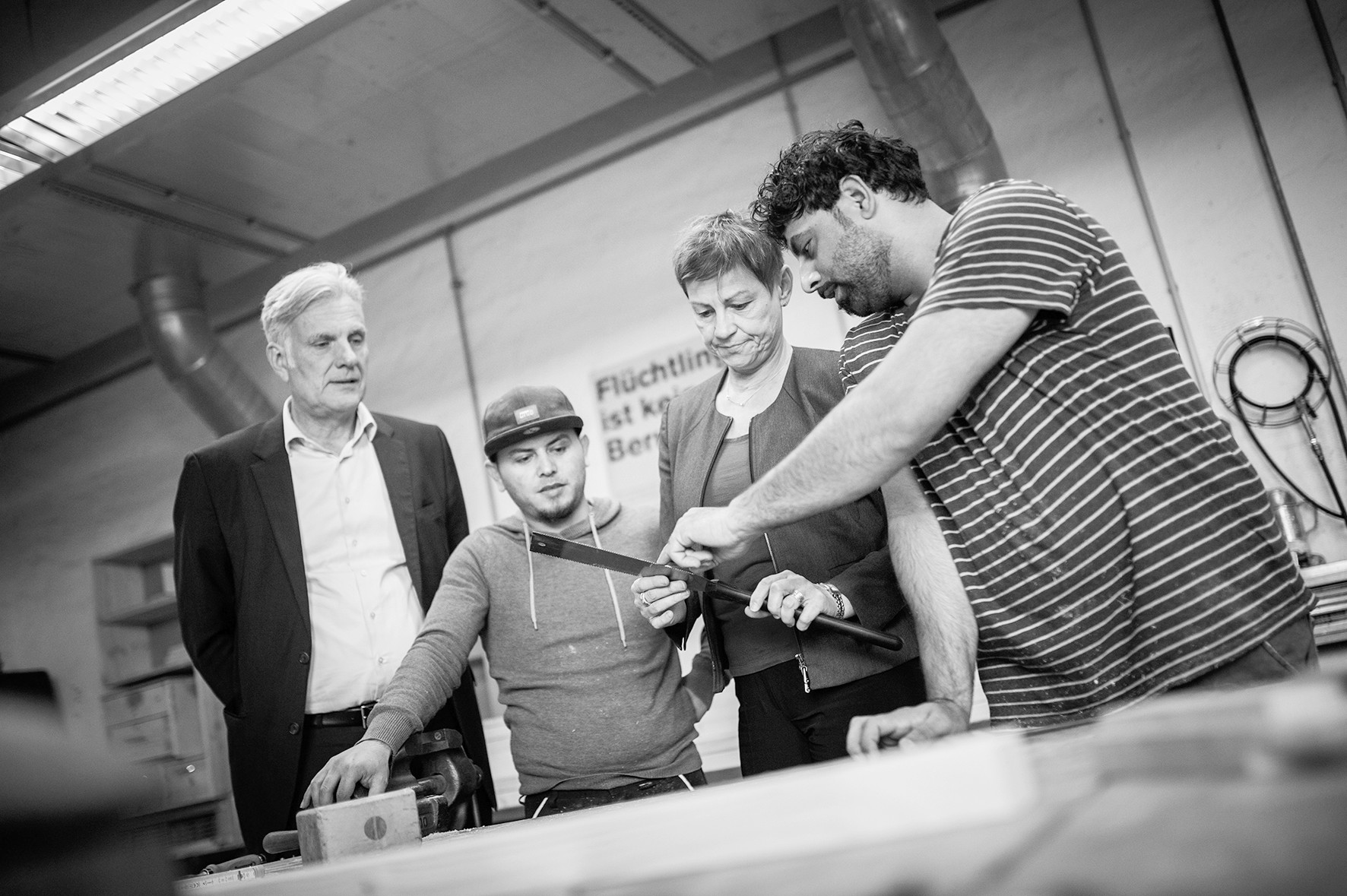 圖片説明:10月30日,柏林工藝品柏林商會女會長和市參議員來到一家為難民提供技術培訓的學校參觀。