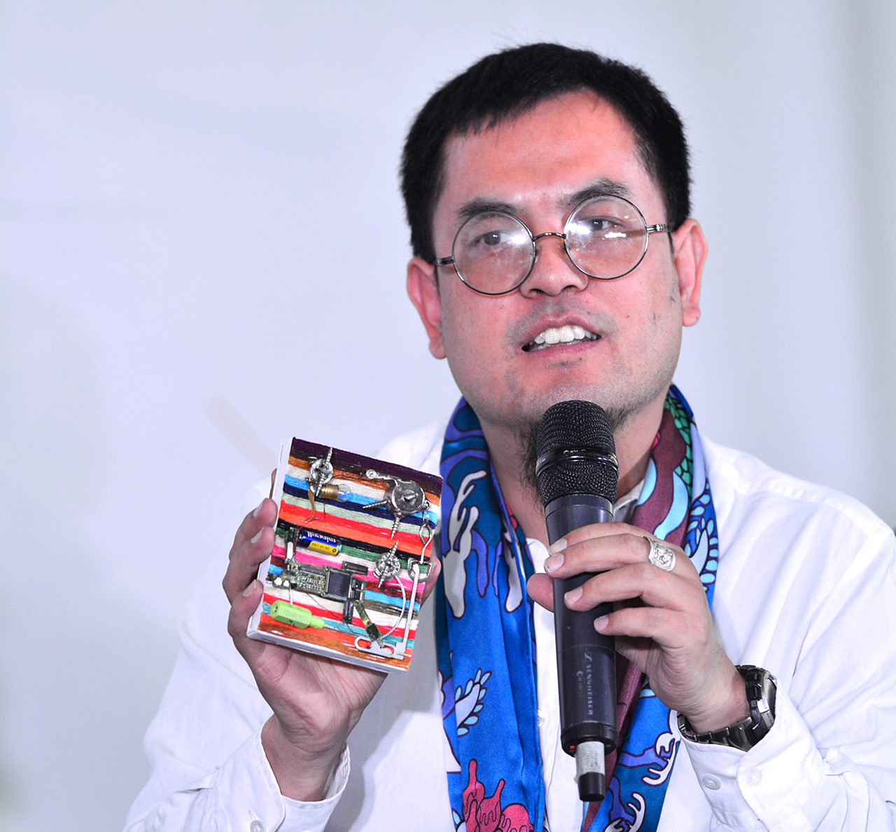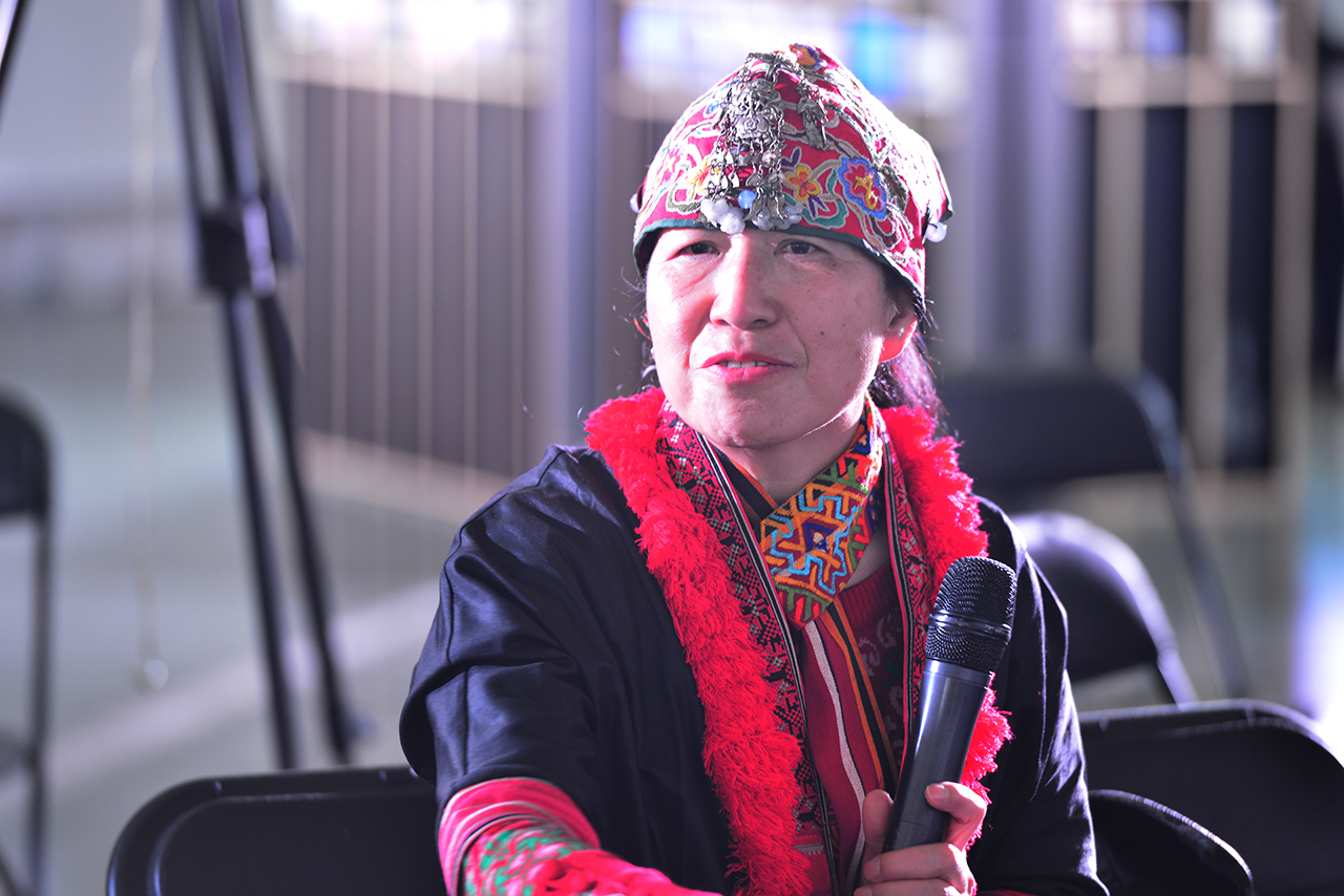 座談會上,滿族藝術家丁•廉•西蒙和大家分享了她的作品《充電》的創作理念。她將個人的情感和人生感悟,通過小小的作品呈現出來,用這種微型藝術的方式表達自己的想法,她覺得“多彩中國”大展帶給了她全新的創作體驗。